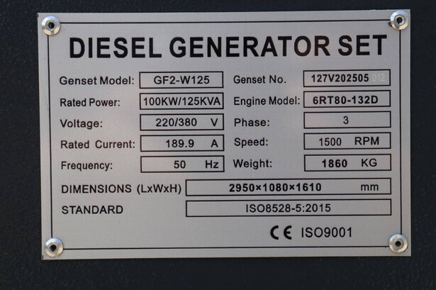 Brand: Ricardo Type: GF2-W100 Year of construction: 2026 Fuel: Diesel Motorcycle Brand: Ricardo Power: 125 kVA Voltage: 380 V Current: 151 A Machine weight: 1860 kg Color: gray