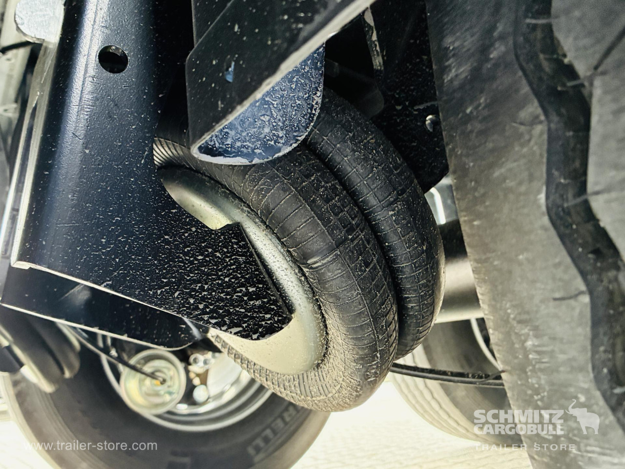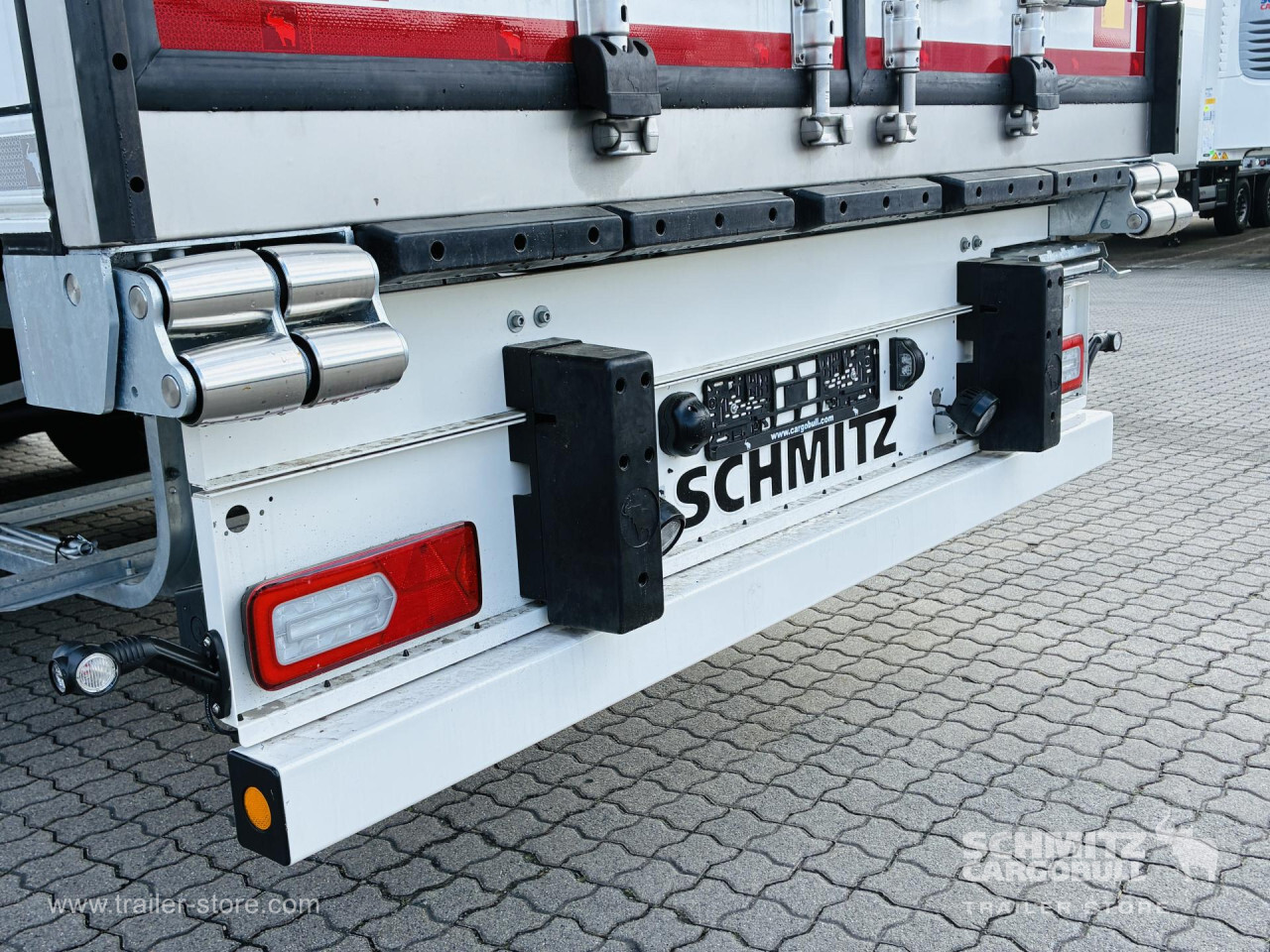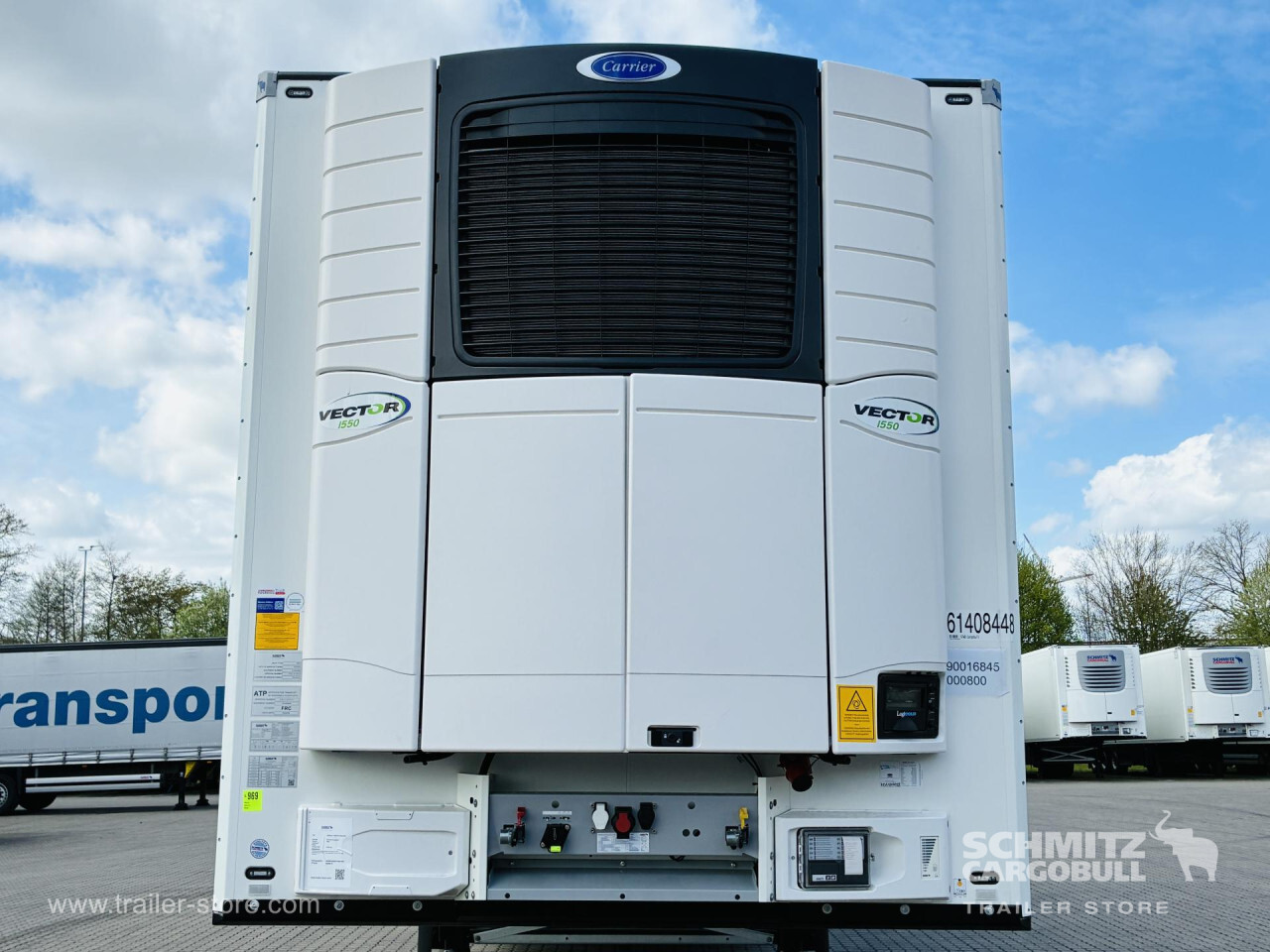 Remarks: **Safety**\\Rear underrun, Antilock Braking System ABS, Telematics system\\\\**Interior**\\ISO partition wall preparation, Temperature recorder, Double deck with beams\\\\**Exterior**\\Air suspension, Lift axle front, Pallet box, Spare wheel carrier double, Bolted chassis, Gantry doors, 1x15 and 2x7 pin plug, Antispray, Dynamic ramp protection (DRP)\\\\**Cargo securing**\\Load securing rail\\\\**Brake system**\\Disc brake, Schmitz ROTOS\\\\**Floor**\\Aluminum floor\\\\**Wand**\\Stirnwand verstärkt\\\\**Wall**\\Frontwall recess for cooling, Wall thickness45 mm\\\\**Cooling unit**\\Carrier Vector 1550\\\\**Loading area**\\Length 13.403 mm, Width 2.490 mm, Height 2.650 mm, Volume 88 m³\\\\**Tyre sizes**\\1. Achse: 385/65 R22.5 , Tread depth: 15 mm / 15 mm, 2. Achse: 385/65 R22.5 , Tread depth: 15 mm / 15 mm, 3. Achse: 385/65 R22.5 , Tread depth: 15 mm / 15 mm\\\\**Other dimensions and weights**\\Payload: 30.318 kg, GVW: 39.000 kg\\\\----