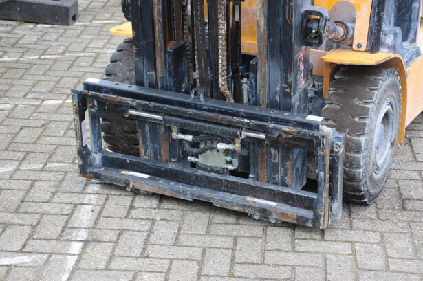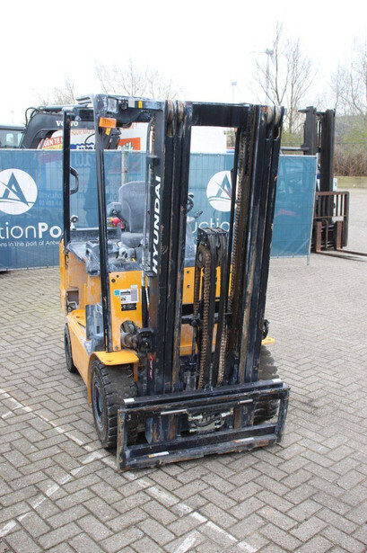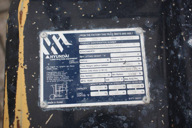 Brand: Hyundai Type: 25B-9 Serial number: HHHB102JK0002464 Year of construction: Not known Fuel: Electric Mast type: Dubbelx Sideshift: Yes Lifting capacity: 2150 kg Lifting height: 4700 mm Recorded operating hours: Not known Tires: Solid tires Color: yellow