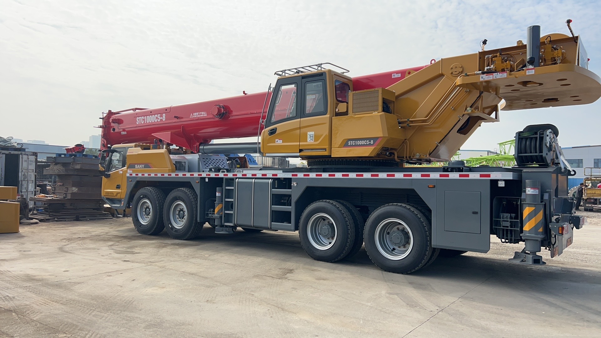 2025 STC1000C5-8 SANY GOOD CONDITION CRANE FOR SALE Extra-large cross-section, superior performance, extra-large main boom (C5: U-shaped; C6: oval-shaped), maximum lifting moment of 3557 kN.m, heavy-load transfer, cost-effective and labor-saving. With 385 large tires in the front + heavy-load axle + second-generation thick plate spring suspension, it can carry 21.5t counterweight + leg pad for quick transfer. Wireless remote control operation + lifting cylinder. A single person can easily complete the disassembly and assembly of the counterweight. Yuchai and Weichai power configurations are available for selection. Low front H leg, span upgrade, and the lifted load is more stable.