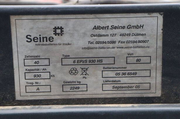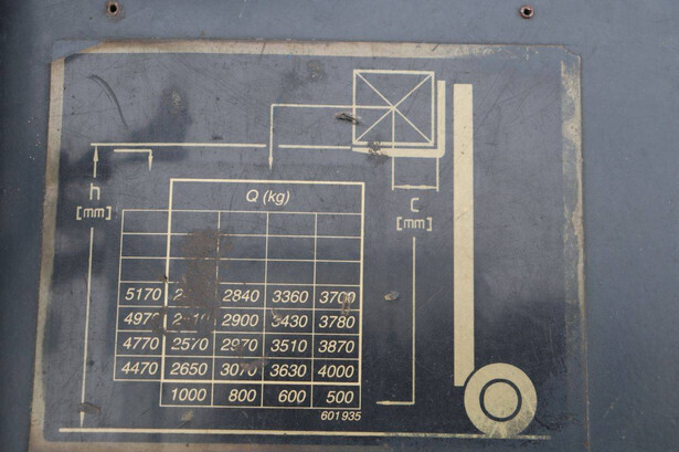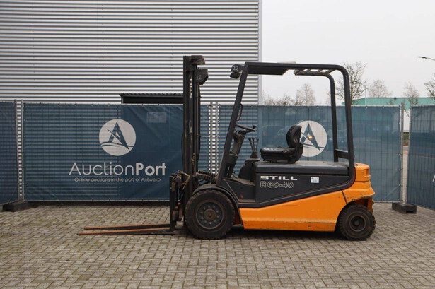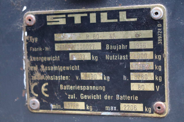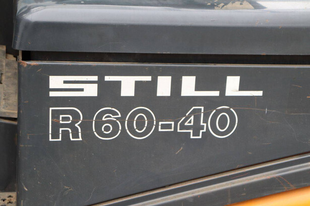 Brand: Still Type: R60-40 Serial number: 516027000027 Year of construction: 1996 Fuel: Electric Mast type: Duplex Sideshift: No Lifting capacity: 4000 kg Lifting height: 5170 mm Operating hours read: 11067 h Machine weight: 9490 kg Tires: Solid tires Color: orange