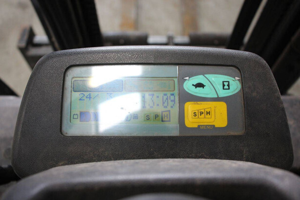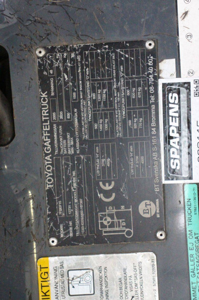 Brand: Toyota Type: 7FBEF15 Serial number: 12731 Year of construction: 2005 Fuel: Electric Mast type: Duplex Sideshift: Yes Lifting capacity: 1500 kg Lifting height: 4500 mm Recorded operating hours: 58,158 h Tires: Non-marking tires Color: gray