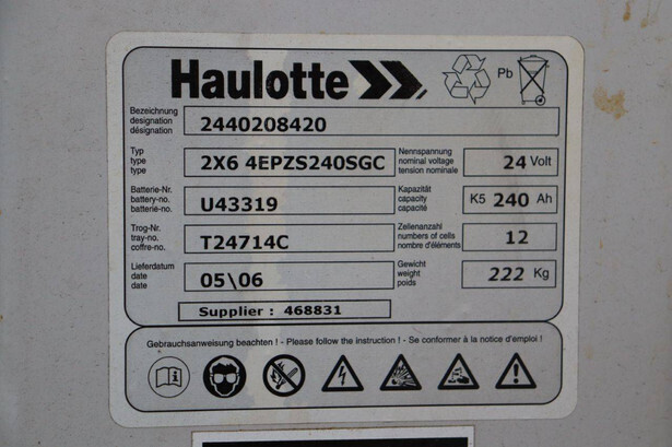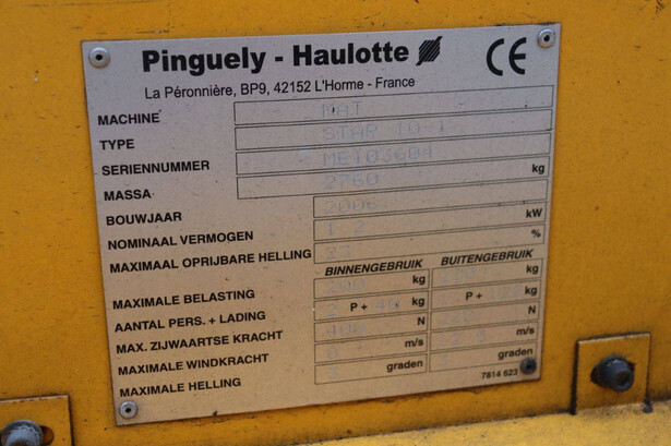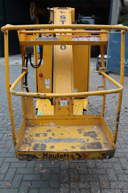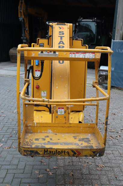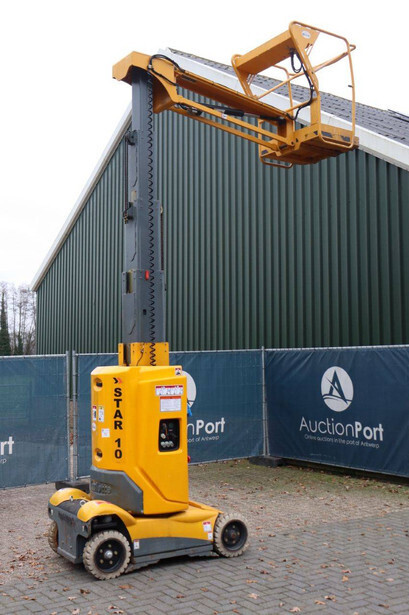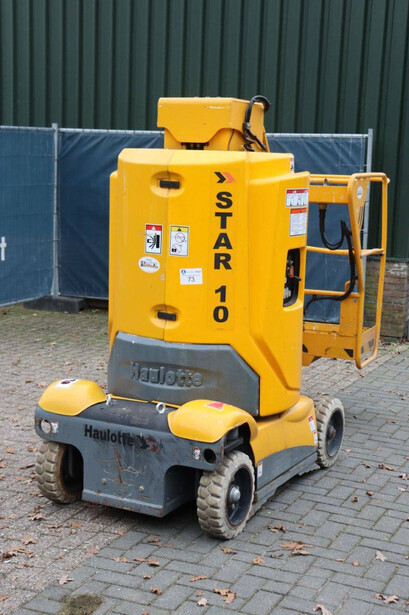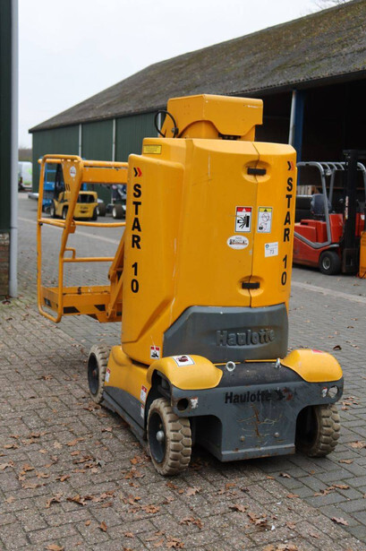 Brand: Haulotte Type: STAR 10-1 Serial number: ME103604 Year of construction: 2006 Fuel: Electric Lifting capacity: 200 kg Working height: 10 m Operating hours read: 367 h Machine weight: 2992 kg Chassis: Wheels Type: Mast lift Tires: Non-marking tires Color: yellow