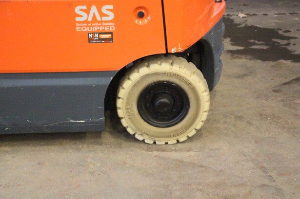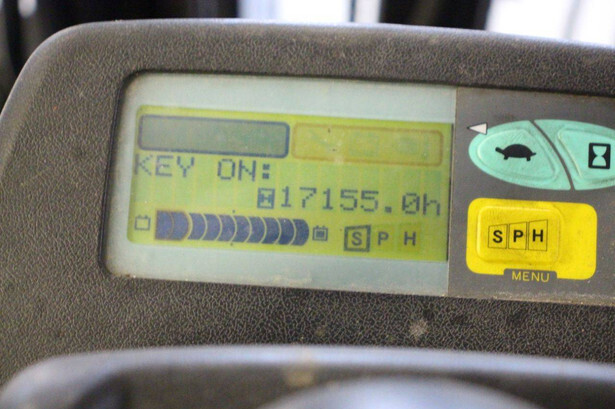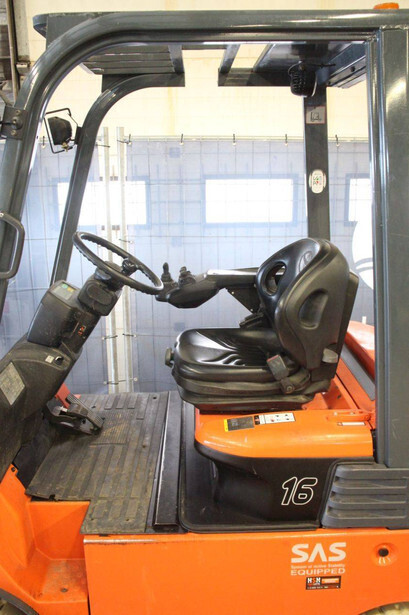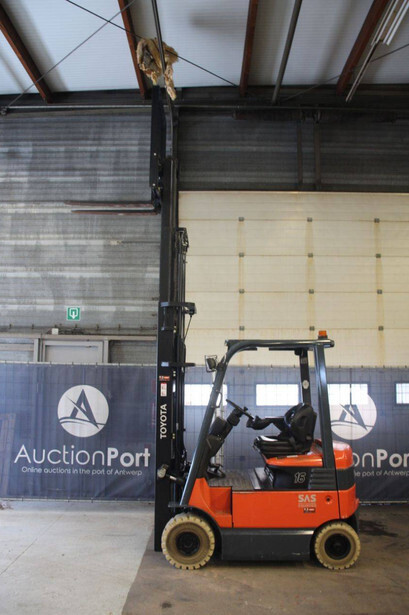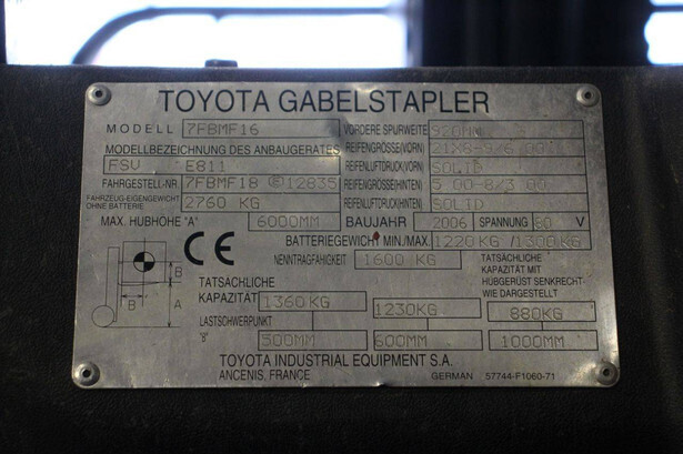 Brand: Toyota Type: 7FBMF16 Serial number: 7FBMF18-012835 Year of construction: 2006 Fuel: Electric Mast type: Triplex Sideshift: Yes Lifting capacity: 1360 kg Lifting height: 6000 mm Reading operating hours: 17155 h Machine weight: 2760 kg Tires: Non-marking tires Color: orange