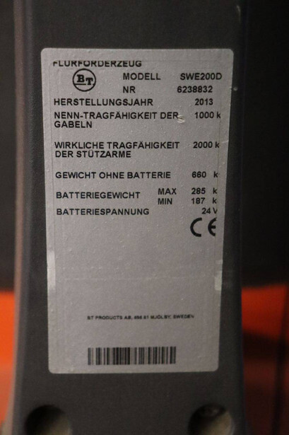 Brand: BT Type: SWE200D Serial number: 6238832 Year of construction: 2013 Fuel: Electric Mast type: Duplex Lifting capacity: 2000 kg Operating hours read: 492 h Machine weight: 945 kg Color: red