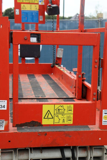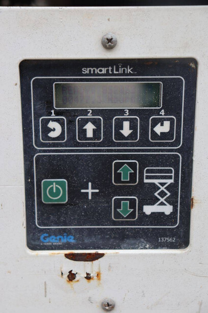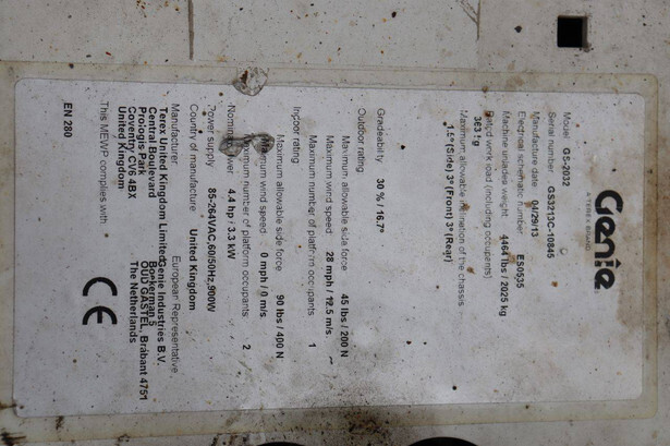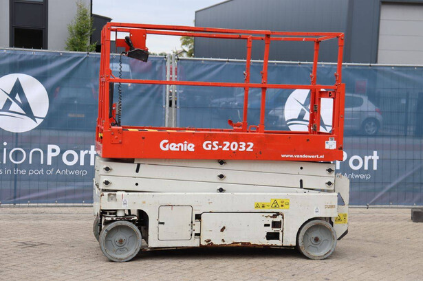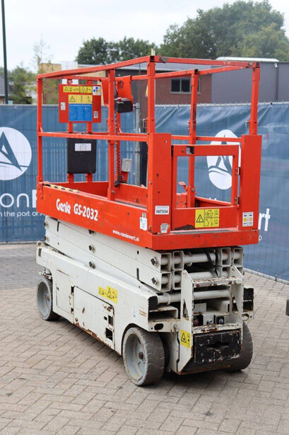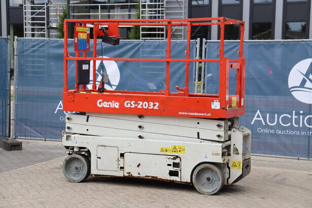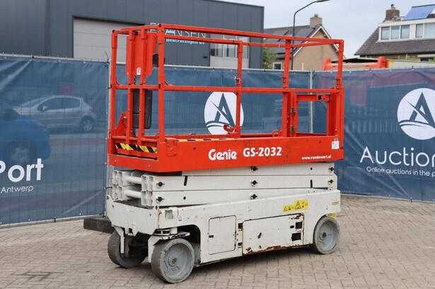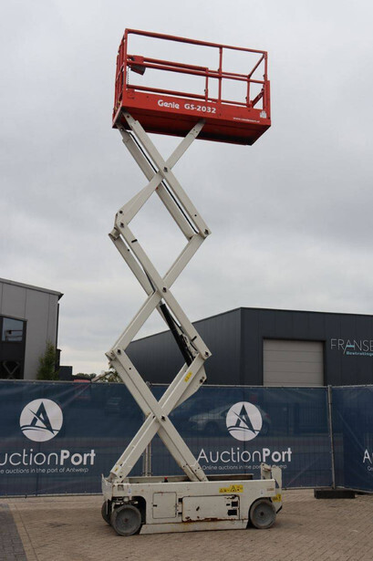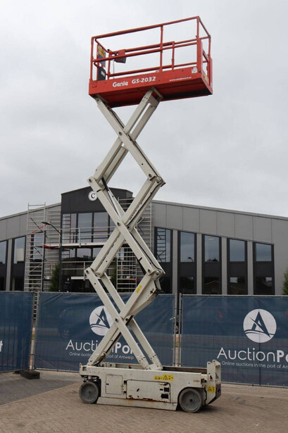 Brand: Genie Type: GS-2032 Serial number: GS3213C-10845 Year of construction: 2013 Fuel: Electric Lifting capacity: 363 kg Working height: 8 m Operating hours read: 477 h Machine weight: 2025 kg Chassis: Wheels Type: Scissor lift Tires: Non-marking tires Color: red