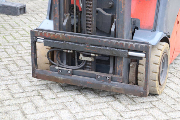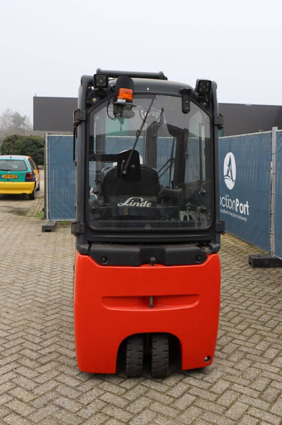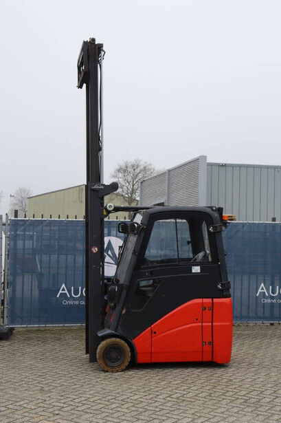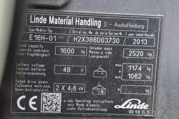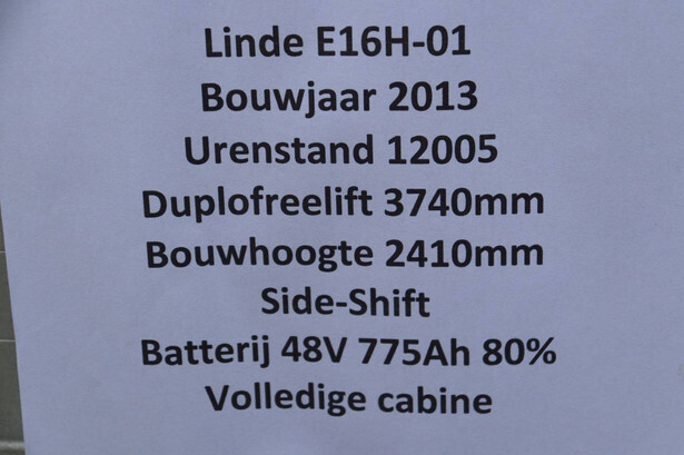 Brand: Linde Type: E16H-01 Serial number: H2X386D03730 Year of construction: 2013 Fuel: Electric Mast type: Duplex Sideshift: Yes Lifting capacity: 1600 kg Lifting height: 3740 mm Operating hours read: 12004 h Machine weight: 3694 kg Tires: Non-marking tires Color: orange
