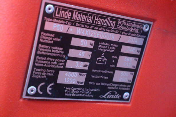 Brand: Linde Type: P60 Serial number: W4X126E00019 Year of construction: 2014 Fuel: Electric Operating hours read: 5532 h Tires: Solid tires Color: red