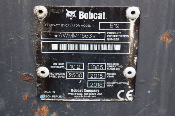Brand: Bobcat Type: E19 Serial number: AWMM11553 Year of construction: 2015 Fuel: Diesel Engine power: 10.2 kW Quick change: No Operating hours read: 3359 h Running gear: Tracks Machine weight: 1885 kg Color: white
