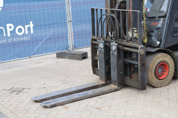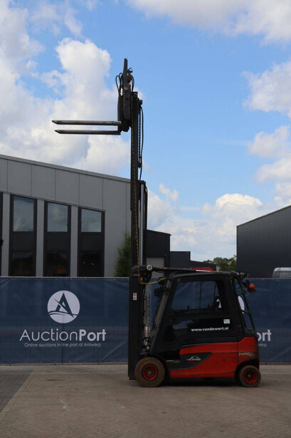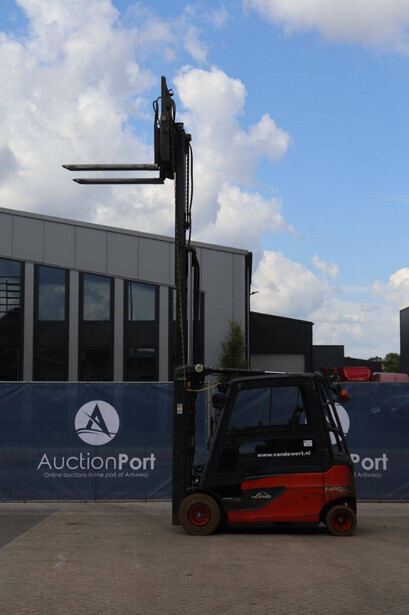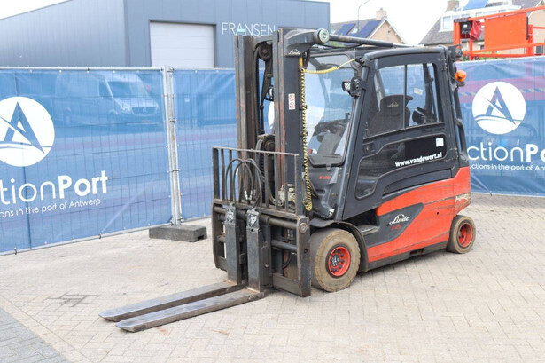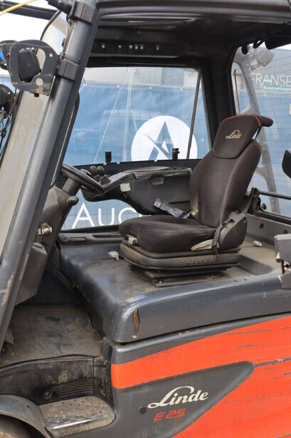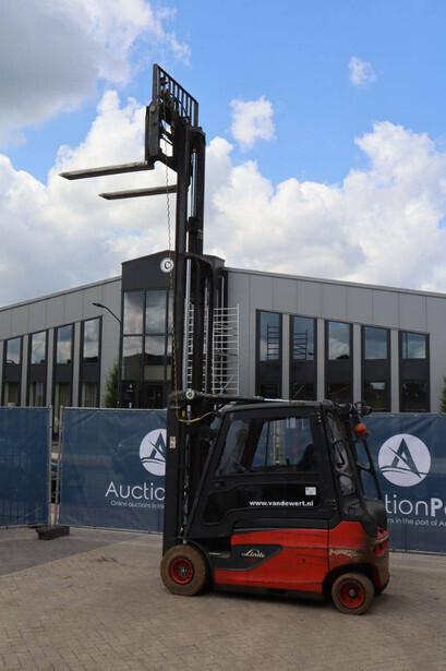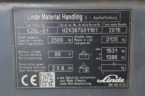 Brand: Linde Type: E25L-01 Serial number: H2X387G01161 Year of construction: 2016 Fuel: Electric Mast type: Plywood Sideshift: Yes Lifting capacity: 2500 kg Lifting height: 4200 mm Recorded operating hours: 17,156 hours Machine weight: 4666 kg Tires: Non-marking tires Color: red
