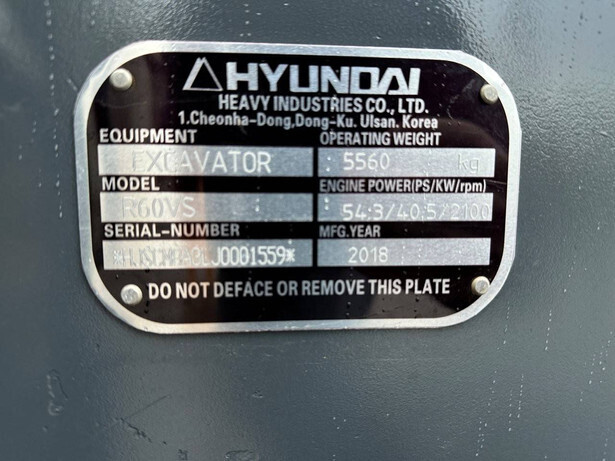 Brand: Hyundai Type: R60VS Serial number: HJSCM8A3LJ0001559 Year of construction: 2018 Fuel: Diesel