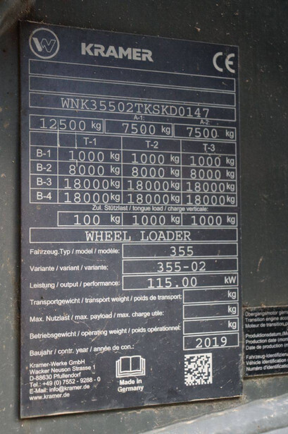 Brand: Kramer Type: 355 Serial number: WNK35502TKSKD0147 Year of construction: 2019 Fuel: Diesel Engine power: 115.0 kW Operating hours read: 973 h Machine weight: 12500 kg Tires: Pneumatic tires Color: yellow