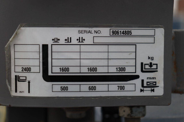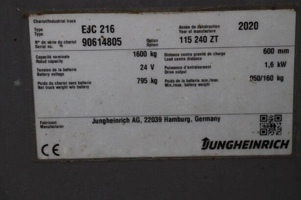 Brand: Jungheinrich Type: EJC 216 Serial number: 90614805 Year of construction: 2020 Fuel: Electric Mast type: Not known Lifting capacity: 1600 kg Lifting height: 2400 mm Operating hours read: Not known Machine weight: 795 kg Color: yellow