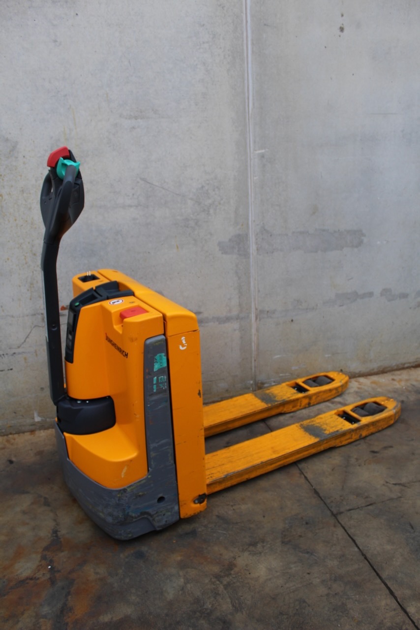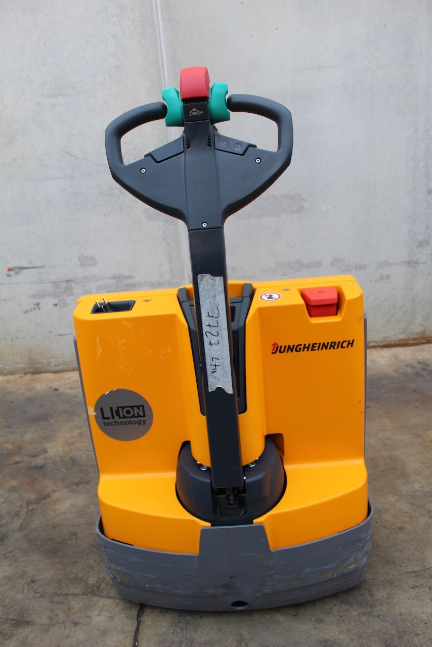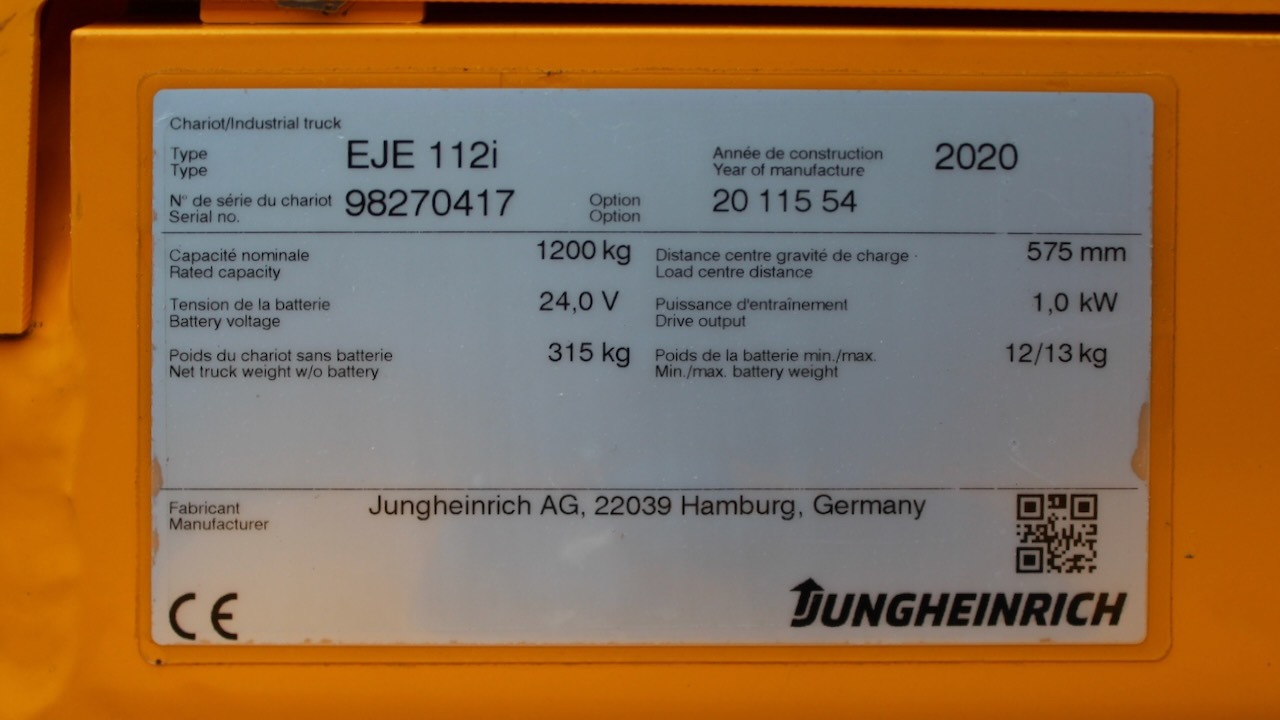 Jungheinrich EJE 112i LI-ION Load capacity: 1.200 Kg Lifting height: Mast: Fork: 1.150 x 540 mm Build height: Motorization: Electric Battery: 24v/40Ah Charger: 24 v incorporated Good condition, ONLY 389 working hours! Lithium battery.