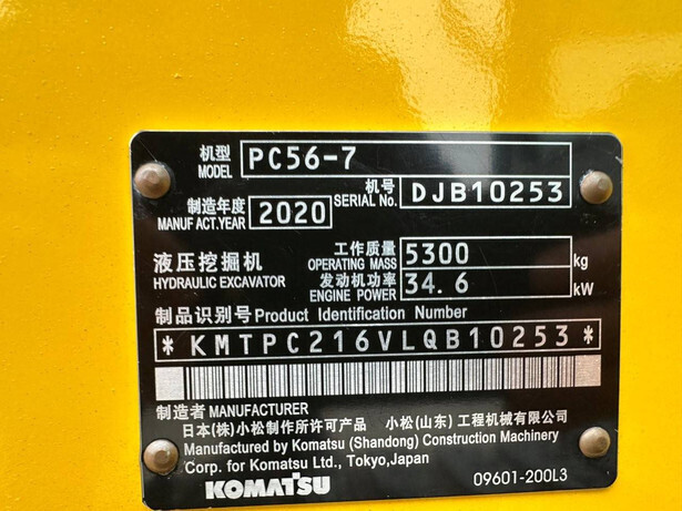 Brand: Komatsu Type: PC56-7 Serial number: KMTCPC216VLQB10253 Year of construction: 2020 Fuel: Diesel Engine power: 34 kW Engine brand: Kubota GB20891 Number of cylinders: 4 Quick change: No Recorded operating hours: 522 h Machine weight: 5300 kg Undercarriage: Tracks Track width: 400mm Bucket width: 650mm