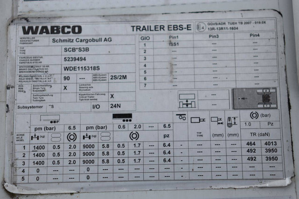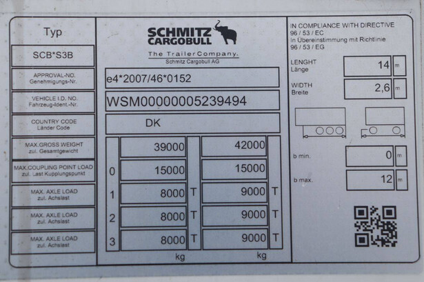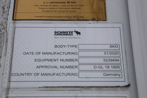 Brand: Schmitz Cargobull Type: SCB S3B Chassis number: WSM00000005239494 Year of construction: 2020 First registration: 21.02.2020 MTM: 39000 kg Number of axles: 3 Brakes: Disc brakes