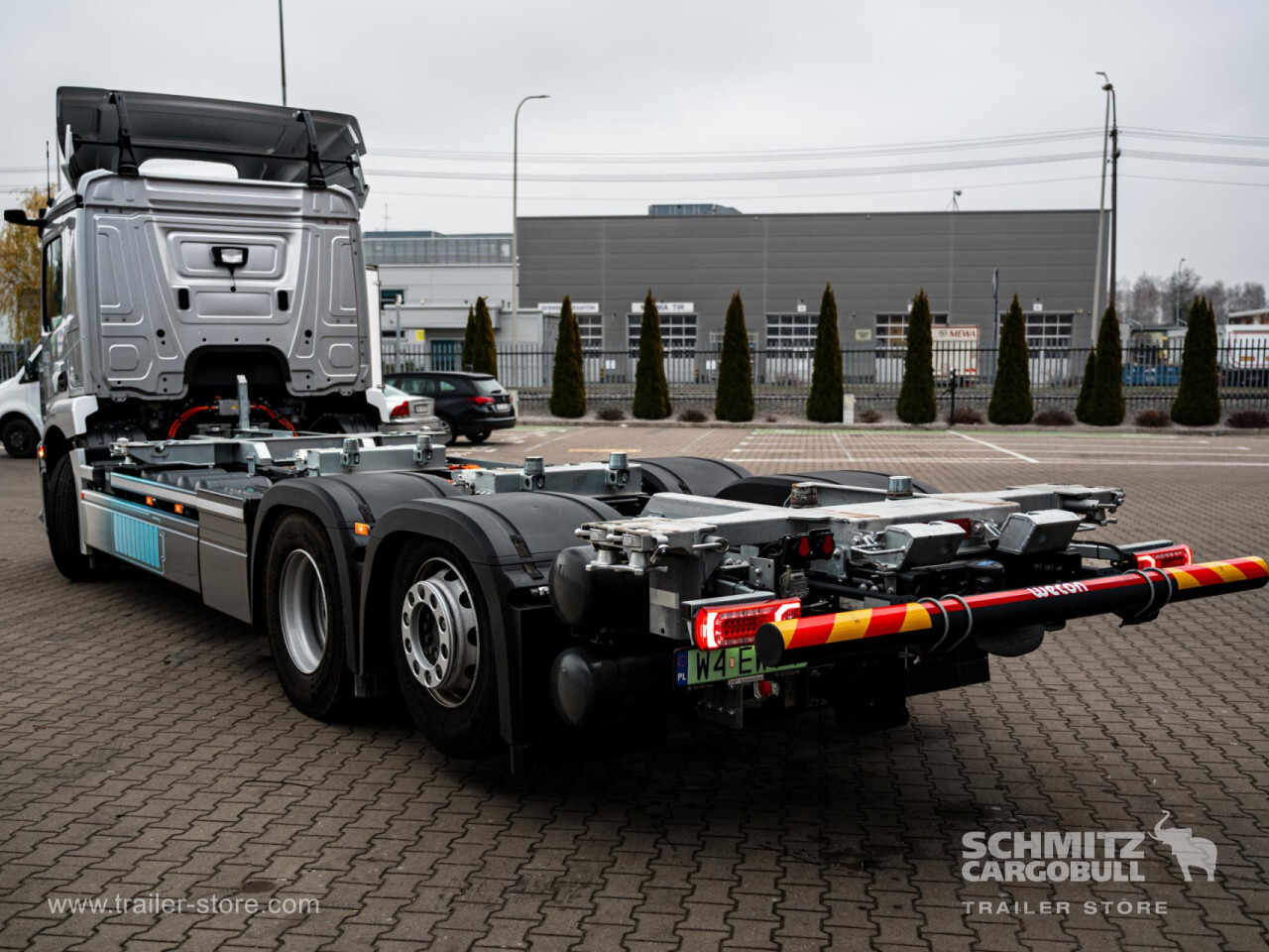 Remarks: **Body**\\Body manufacturer: Wesob\\\\**Transmission**\\Automatic\\\\**Assistance systems**\\Electronic Brake System EBS, Cruise control, Lane Departure Warning System LDWS, Hill Hold Control HHC\\\\**Light and sight**\\Rain sensor, Fog lights, Daytime running lights, Light sensor, adaptive wiper/washer system\\\\**Audio & communication**\\Radio\\\\**Exterior**\\Pneumatic air suspension, Lift axle, Demount BDF, Self-levelling suspension, Roof spoiler, Electr. rear view mirrors, Differential lock, Twin tyres, Speed limiter, Trailer Brake Connection\\\\**Safety**\\Driver's airbag, Electr. Stability Programm ESP, Anti Slip Regulation ASR, Antilock Braking System ABS, Anti-theft alarm, Outside temperature indicator\\\\**Interior**\\Tachograph, Board computer\\\\**Comfort**\\Air conditioning, Comfortable seats, Air-suspended driver seat, Passenger bench, Power steering, Adjustable steering column, Electric window lift, Central locking, Digital dash\\\\**Loading area**\\Length 5.853 mm, Width 2.259 mm\\\\**Tyre sizes**\\ 315/70 R22.5 , 315/70 R22.5 , 315/70 R22.5\\\\**Other dimensions and weights**\\Payload: 11.000 kg, GVW: 27.000 kg, Wheel base: 4.900 mm\\\\----