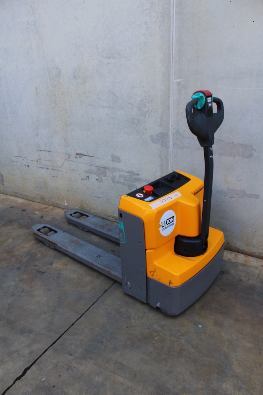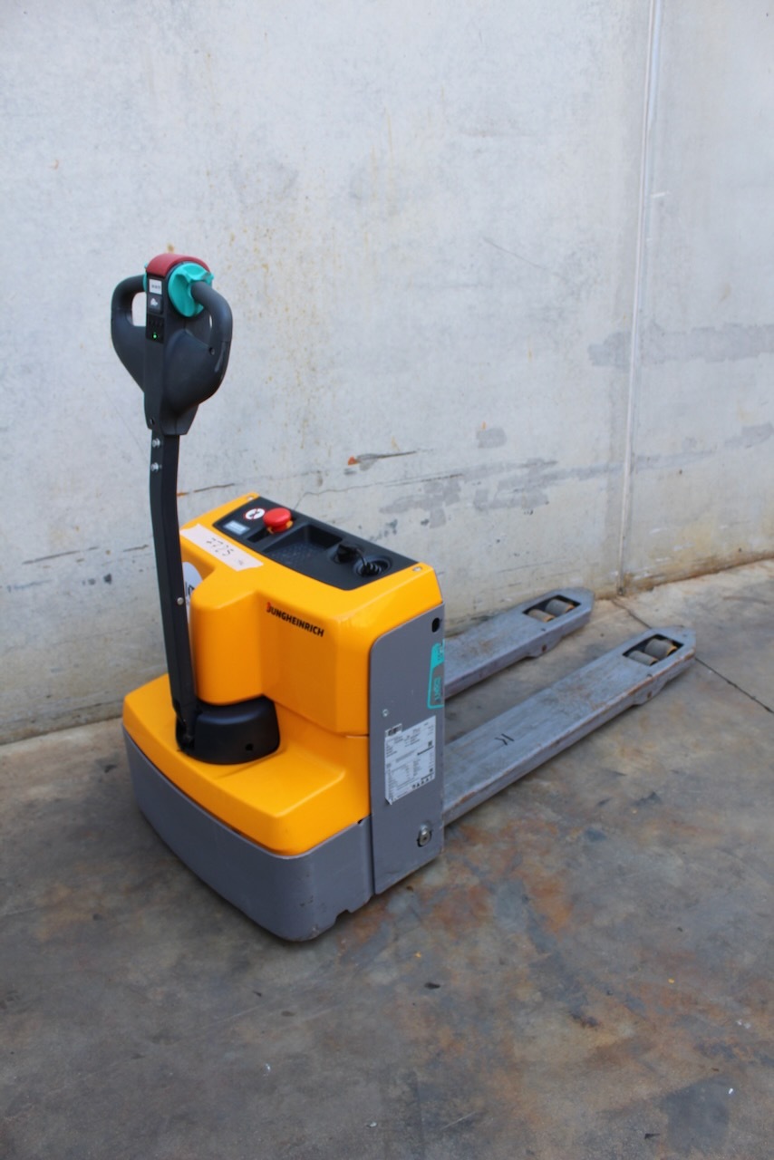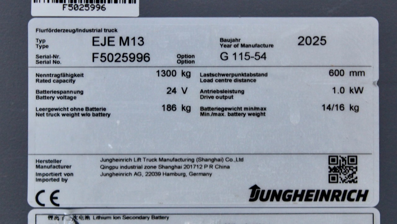 Jungheinrich EJE M13 LI-ION Load capacity: 1.300 Kg Lifting height: Mast: Fork: 1.150 x 540 mm Build height: Motorization: Electric Battery: 24v/50Ah Charger: 24 v incorporated Good condition, ONLY 46 working hours! Lithium battery.